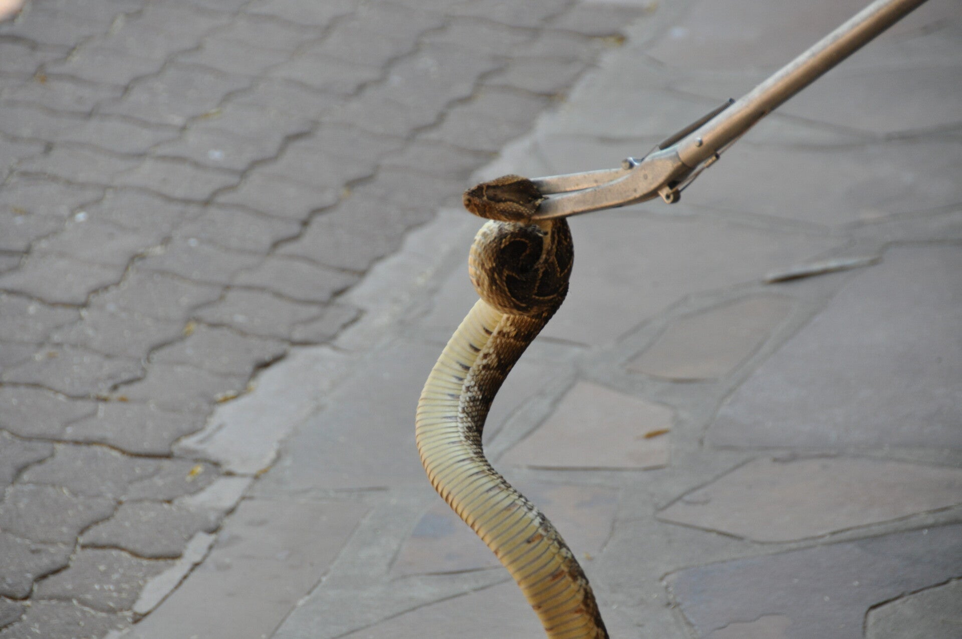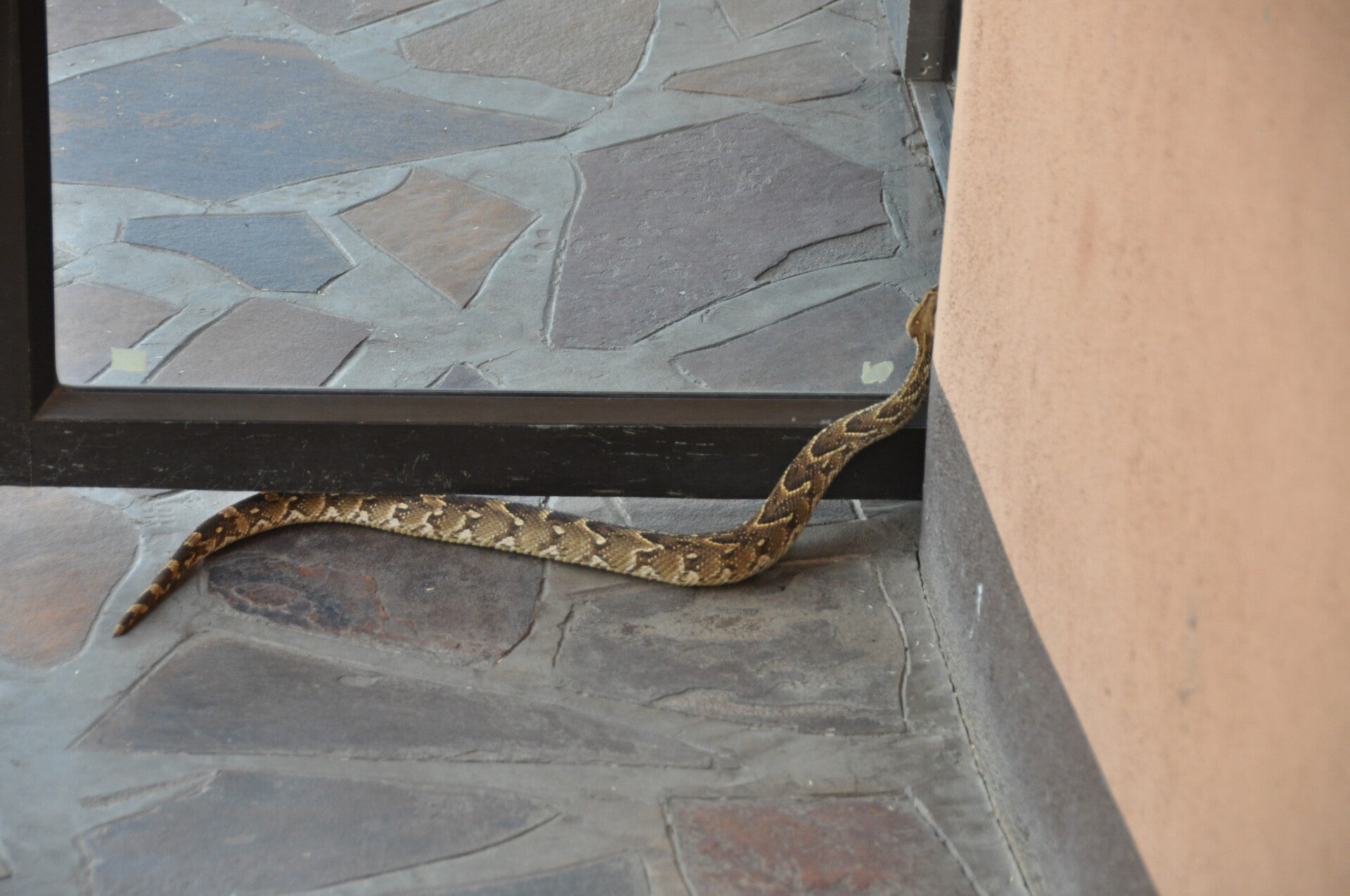 Net buiten Otjiwarongo gaan we rechtsaf de D2440 op. We komen voorbij de plaatselijke vuilstort en een militaire basis. Dan door het hek en we zijn op de weg naar CCF. Aan de rechterkant zie je ook de township van Otjiwarongo, van deze kant lijkt de stad groter dan vanaf de kant van Windhoek. Bij CCF maken we een drive van een uur om de cheeta’s die niet gerehabiliteerd kunnen worden te vinden. We vinden: Amani, Blondi, Dusty en Samantha. Ze zijn gewend aan de auto en zien er goed uit. Daarna gaan we kijken naar het voeren van een aantal andere cheeta’s. Ze eten uit bakken en eentje eet apart omdat hem nogal eens het voer werd afgenomen en hij daar gestrest van raakte. Een drietal dat met elkaar optrekt eet ook samen, ieder heeft zijn eigen bak en eet netjes en beschaafd, geen bloederige wilde taferelen te zien. Als laatste wordt een viertal jongere cheeta’s gevoerd, zij vliegen de kooi binnen, grijpen het vlees en gaan uiteindelijk ook uit hen eigen bak eten. Als ze eenmaal aan hun bak liggen eten ook zij netjes en beschaafd. Daarna gaan we nog naar het museum, de kliniek waar alle onderzoek gedaan wordt en dan gaan we ook nog kijken waar de Anatolische herders opgevoed worden. Deze Turkse herder wordt hier gefokt en getraind om aan boeren verkocht te worden voor N$ 700.= ( ongeveer € 70). Net als in Turkije waar hij de schapen voor de wolven behoed moet hij dat in Namibië doen voor het wild. De resultaten hiervan zijn goed. Er zijn tot nu toe ongeveer 350 honden geplaatst die ook jaarlijks een check up krijgen vanuit CCF. Dit is vaker of te duur of te ver weg voor lokale boeren. Nu gaan we wat drinken op het terras bij de receptie en ineens worden we geroepen, een pofadder. Snel wat foto’s maken en dan wordt hij gevangen en afgevoerd.