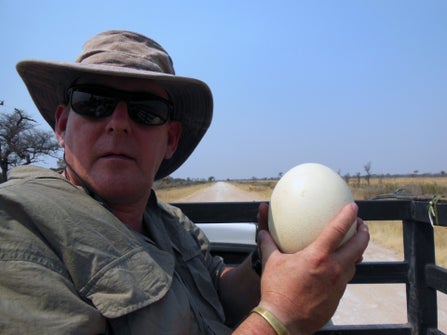 Arno pikt ons op en dan zijn er 2 jagers een eind de andere kant uitgelopen. Ze komen terug met een struisvogelei. Dat wordt vanmiddag voor ons klaar gemaakt. Dan achter in de pick up, en terug naar kamp voor een biertje en een heerlijke lunch. De kleine baby porcupines wachten al op ons, de dochter van het gezin dat samen met ons in het Nhoma Camp zit voert ze 3 keer per dag. Er is nog tijd voor een kleine siësta, wel een warme siësta.