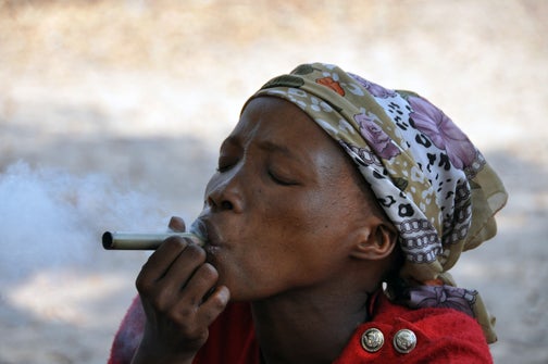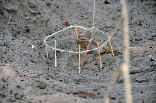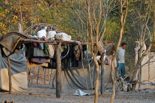 De jagers zoeken het spoor van porcupine. En zoeken en zoeken. Na ongeveer 2 uur hebben ze wel sporen gevonden, ook een hol waar ze mogelijk in hadden kunnen zitten maar geen vangst. Ondertussen kijken ze ook in de bomen of er soms bijen in zitten, honing verzamelen is ook een van hun bezigheden. Het wordt al warmer en ze gaan wat roken. Nemen wij ook maar een pauze. Hierna gaan we verder, zoeken, zoeken, zoeken, helaas vandaag geen eten. Dan laten ze nog zien hoe ze van sanseveria en wat takken een val maken. Sanseveria plukken, draad van maken, knopen, een buigzaam takje pakken, een klem maken van een andere tak en dan met een klein besje als baat…. Een val maken. Ziet er simpel uit, doe het echter niet na. Om van de sanseveria. een draad te maken heb je enkel een mes en een slipper nodig. Echt waar!Ik weet zeker dat ik geen week, nee geen 2 dagen in de bush kon overleven. Ook vinden ze nog een ronde knol ( Rapionacme Velutina ) waar ze de bast vanaf schillen en dan het vlees eraf raspen met een mes. Dit knijpen ze uit en via hun duim drinken ze hiervan. Schijnt bitter te smaken. Ik heb het niet geproefd, wel mijn handen mee gewassen. Dan door de hitte terug naar de weg lopen. Waar is de weg, ik ben mijn coördinatie aardig kwijt. We lopen en lopen en uit eindelijk zie ik het verdwaalde bord aan de kant van de weg. Gelukkig, terug naar de bewoonde wereld. We hebben een biertje verdiend.