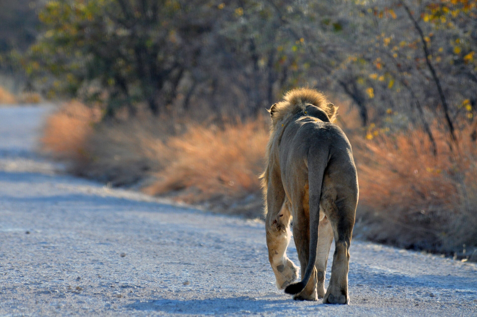 Weer vroeg op, koffie drinken, inpakken, ontbijten, uitchecken en om 06:15 staan we voor de gate. We gaan naar Namutomi, een oud Duits fort aan het einde van Etosha NP. We vermijden de weg waar aan gewerkt wordt en gaan via andere weggetjes richting ons laatste onderkomen in dit park. We zien geen biet, ja af en toe een vogel maar verder, zelfs geen springbok. Het is al bijna 09:00 voordat we ineens een leeuw langs de kant van de weg zien lopen.